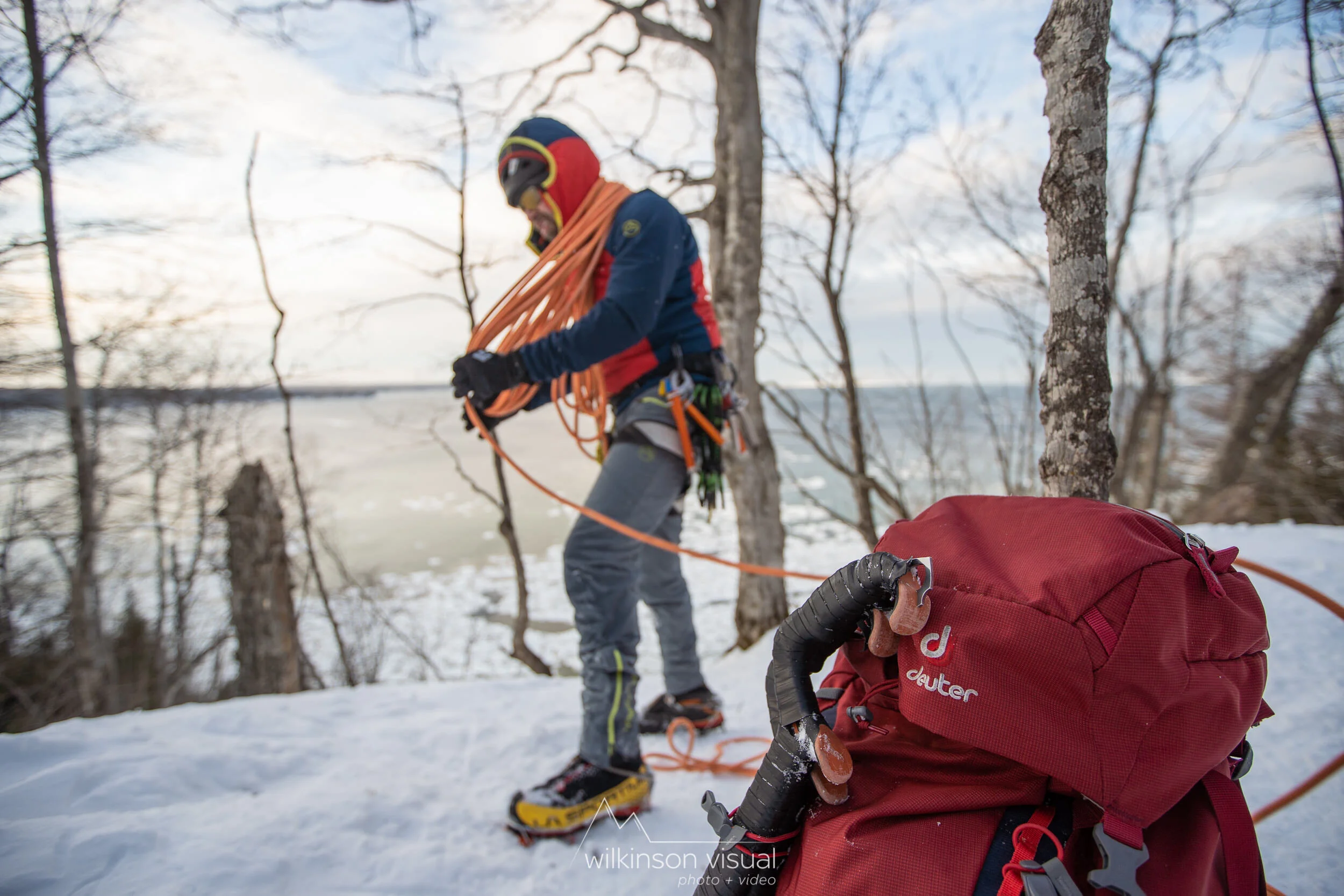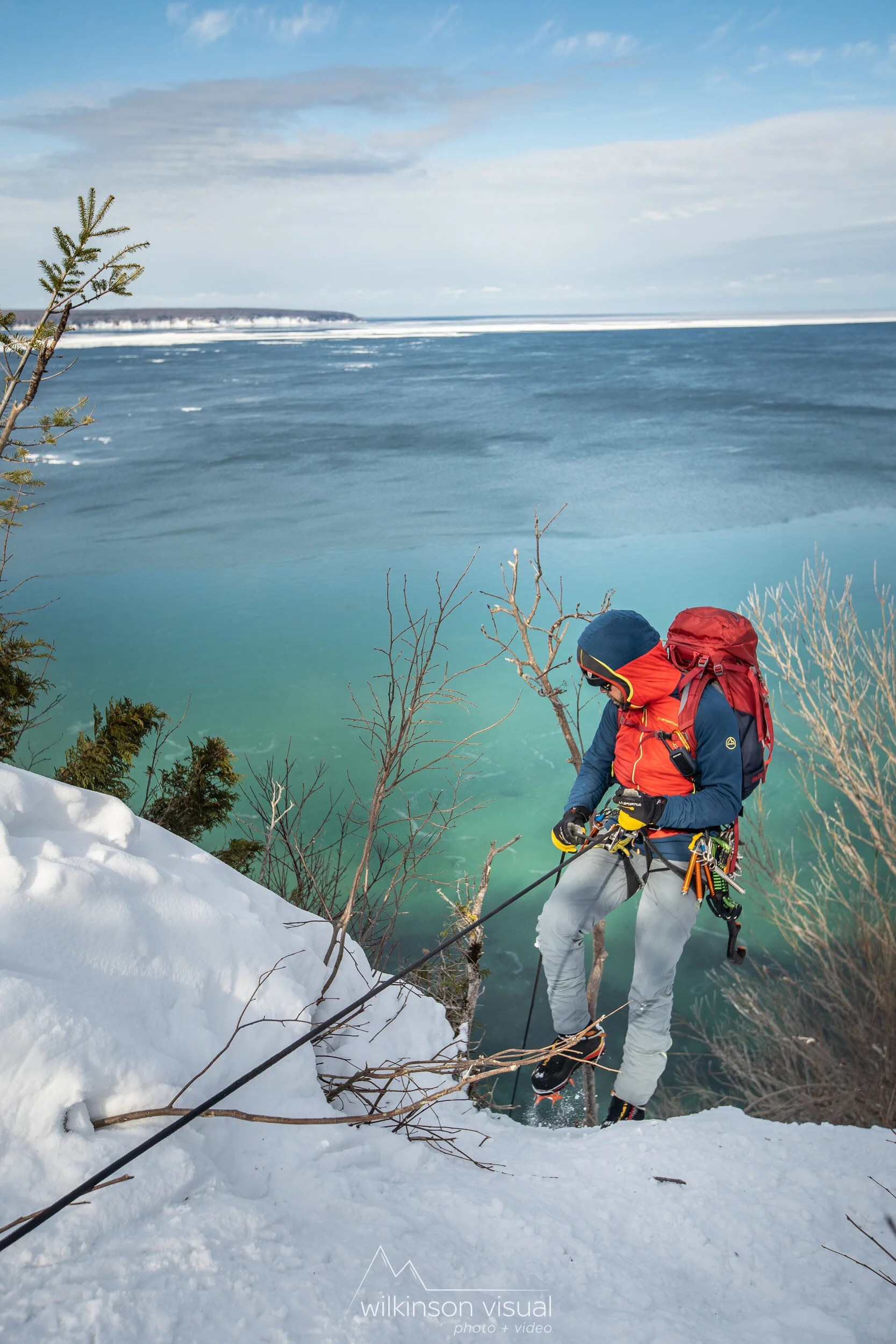 Photos of Ari Novak ice climbing in Michigan, Pictured Rocks National Lakeshore in February of 2020. All photos available in high resolution. Please contact mike@wilkinsonvisual.com for licensing inquiries.
